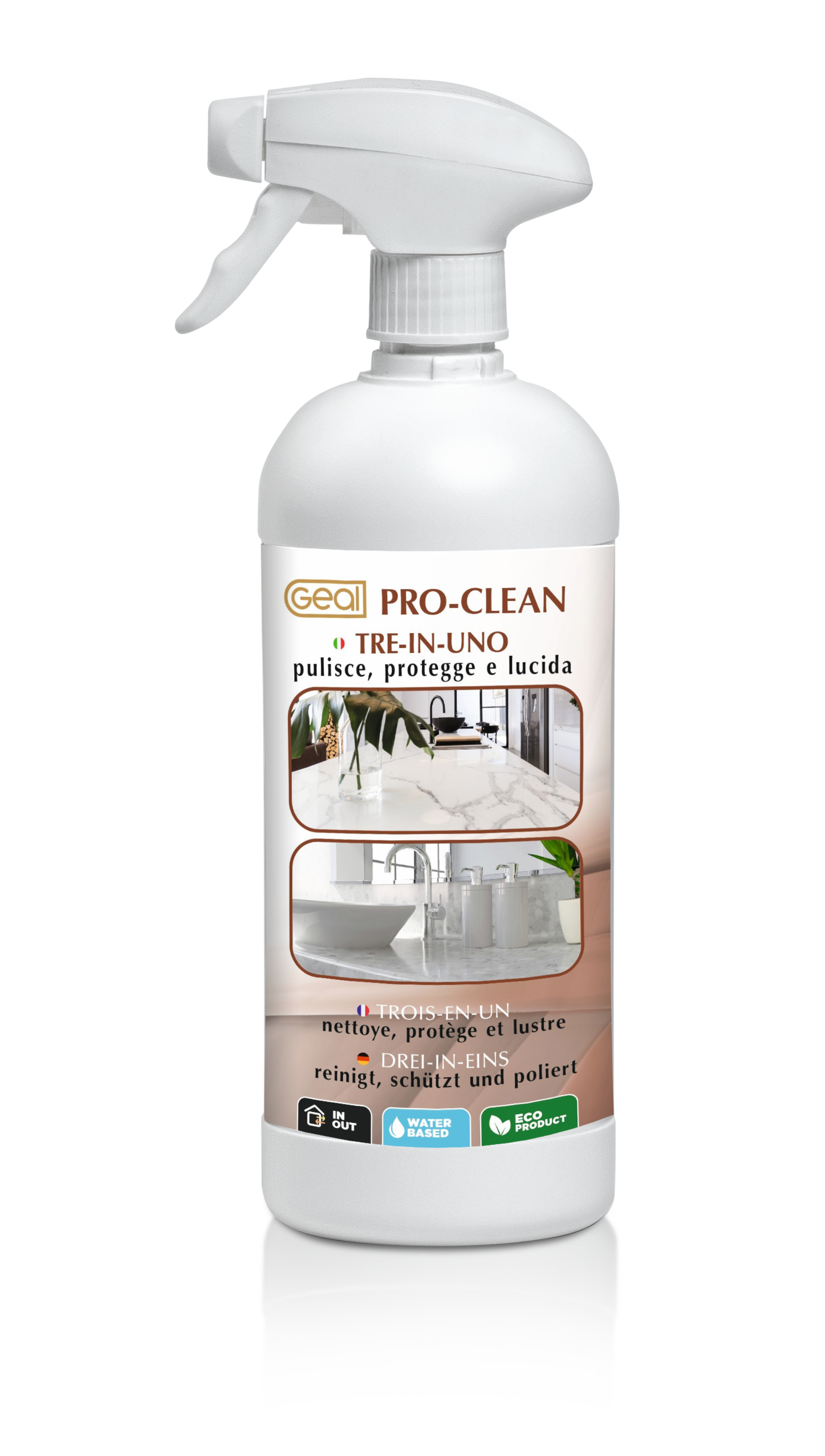 Produit à base d'eau prêt à l'emploi, spécifique pour l'entretien des surfaces en marbre, granit et quartz. Fourni avec flacon pulvérisateur, idéal pour les plans de travail de salles de bains et de cuisines. Son action nettoyante et lustrante est associée à une protection hydrofuge et oléofuge sans former de film ni de traces superficielles. Réduit l'absorption d'eau, repousse l'huile et la graisse, ne jaunit pas (résistant aux UV), maintient la respirabilité du matériau.